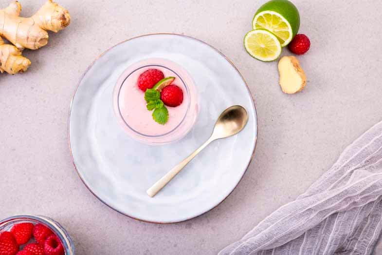 - 6. Häll upp i en skål och dekorera med mynta och färska hallon.
